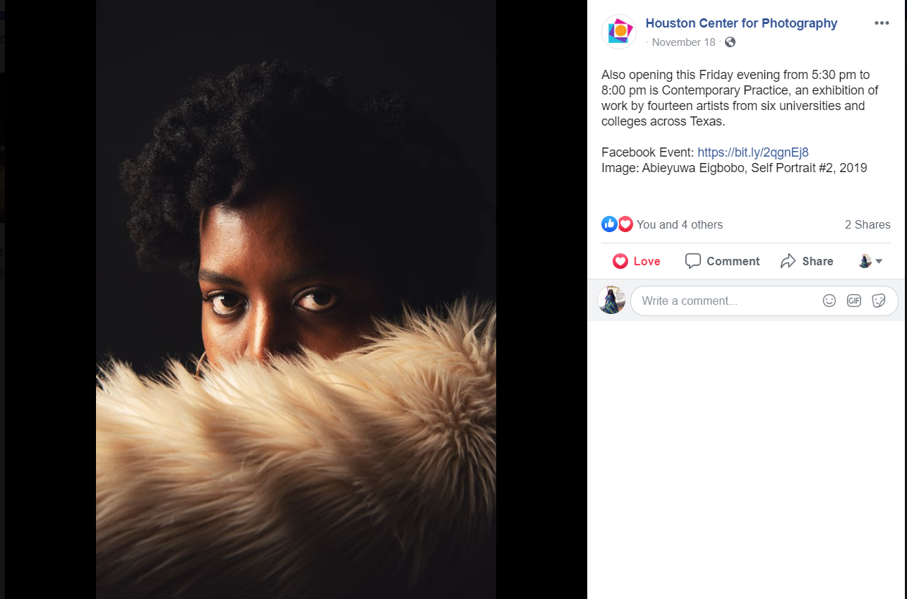 My Self Portrait was included in the Contemporary Practice Exhibition 2019 at the Houston Center For Photography.
